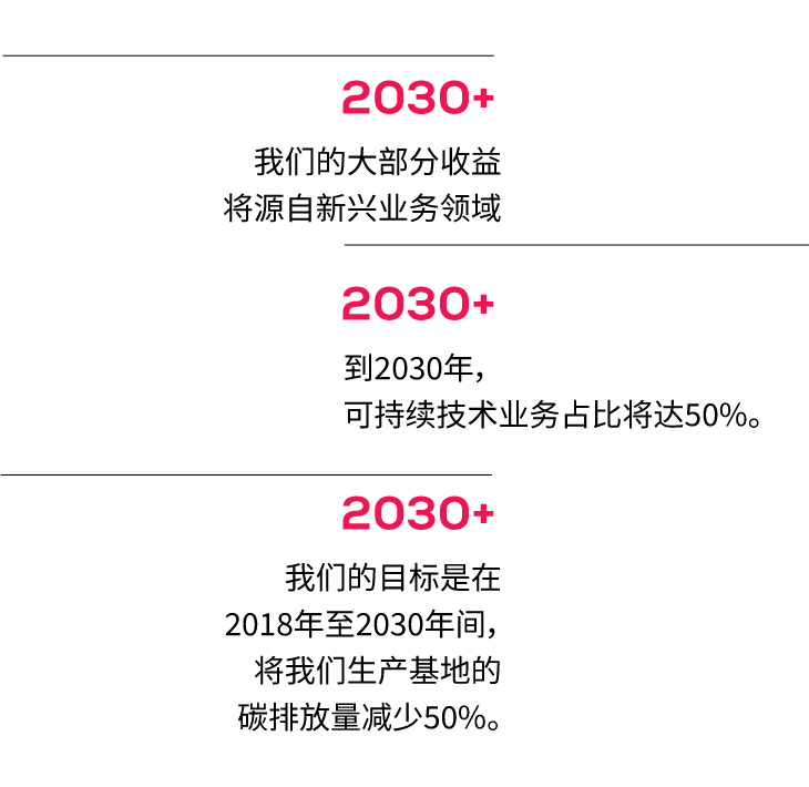 这段经历无疑已让我们为迄今为止所面临的最大挑战做好了全方位准备:我们决心与客户携手并肩,将应对气候变化的行动转化为公司未来业务增长的驱动力。我们深耕于对世界经济举足轻重的行业领域,提供能够显 著削减那些减排难度极大行业的系统解决方案。